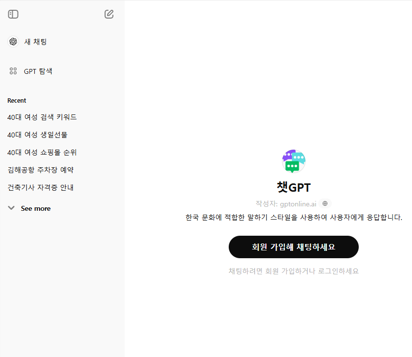 로그인 하면 아래와 같은 그림으로 화면이 뜨는데 왼쪽 상단에 "새 채팅"을 눌러줍니다.